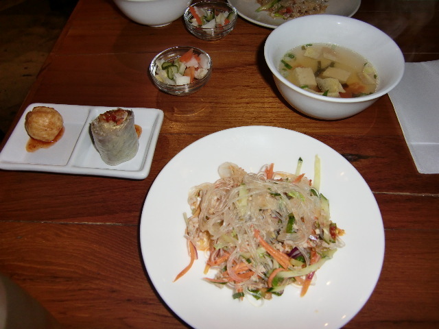 スープ、前菜の生春巻きとエビ団子?と春雨の炒め物・・これ・・からかった~(>0<)