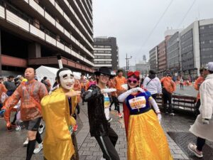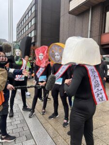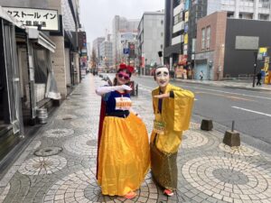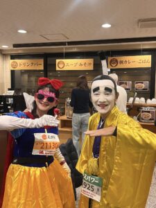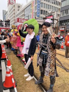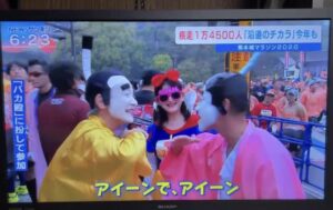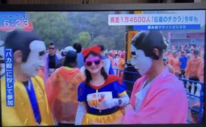 昨年も同じ仮装をされていた郷土料理隊の皆様がTV取材を今年も受けておられました