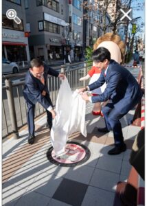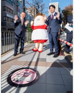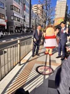 舗道に設置されたばかりのあたしンちマンホール蓋の除幕を!