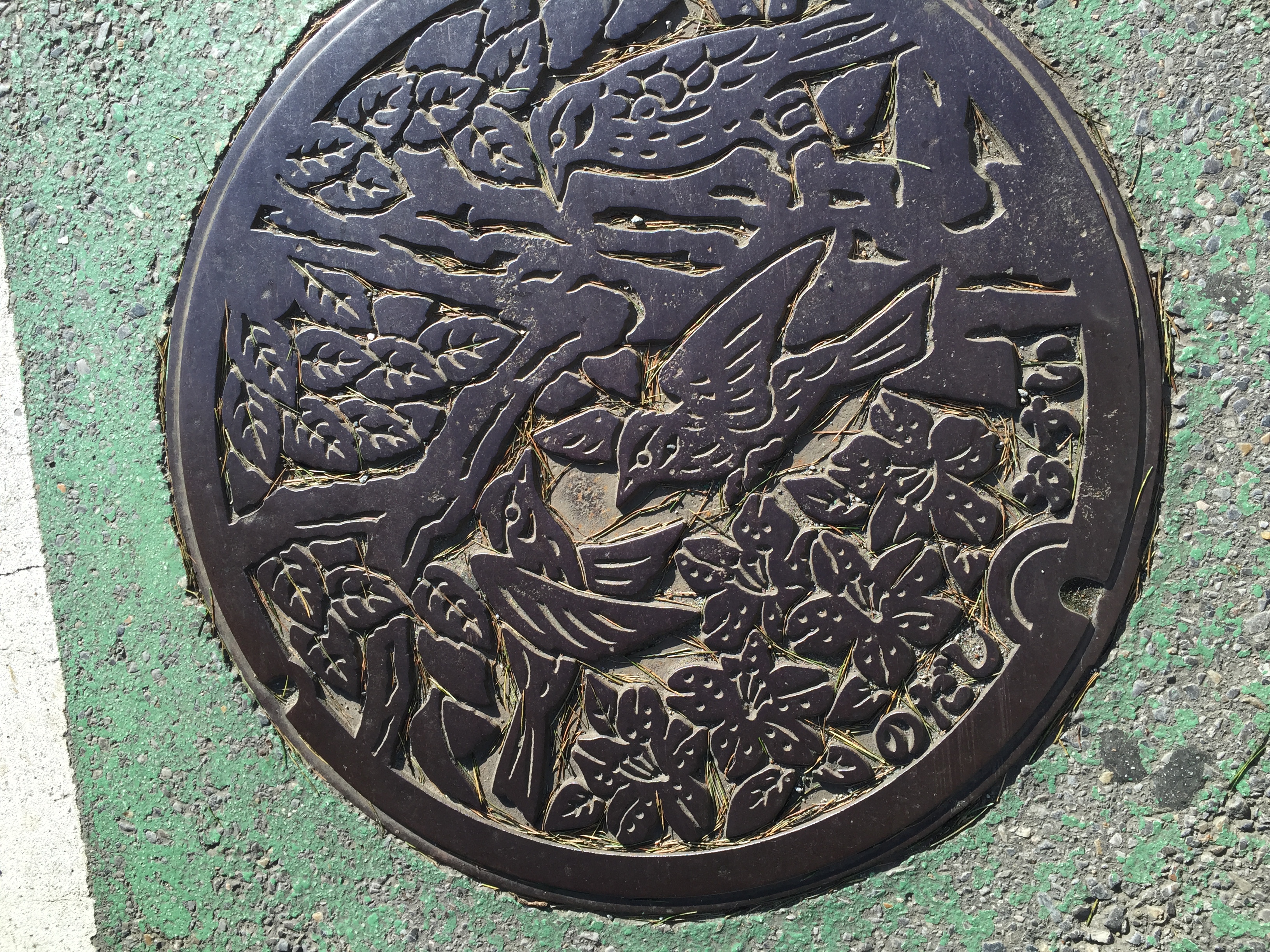 足元のマンホールは可愛い鳥が描かれています
