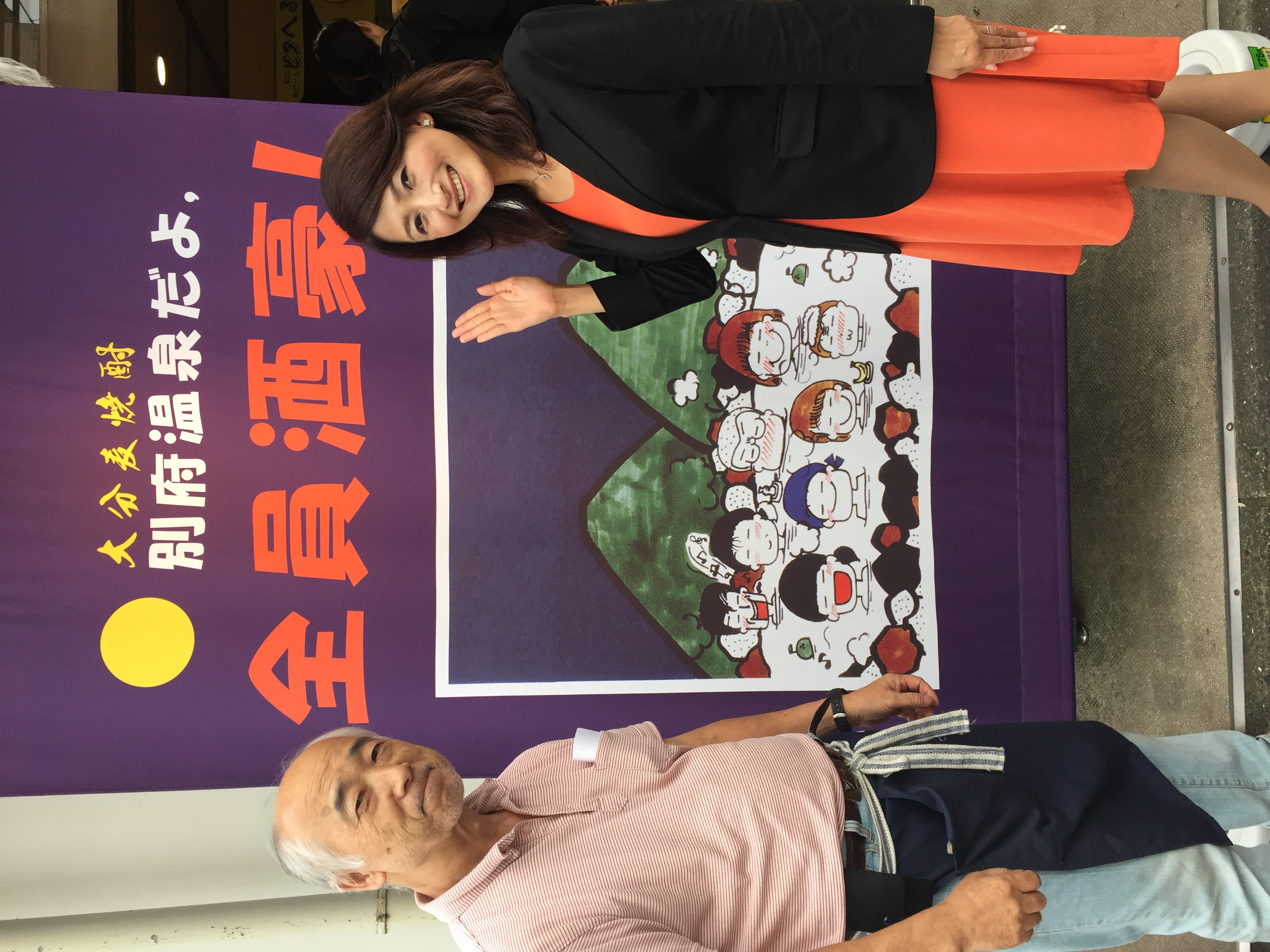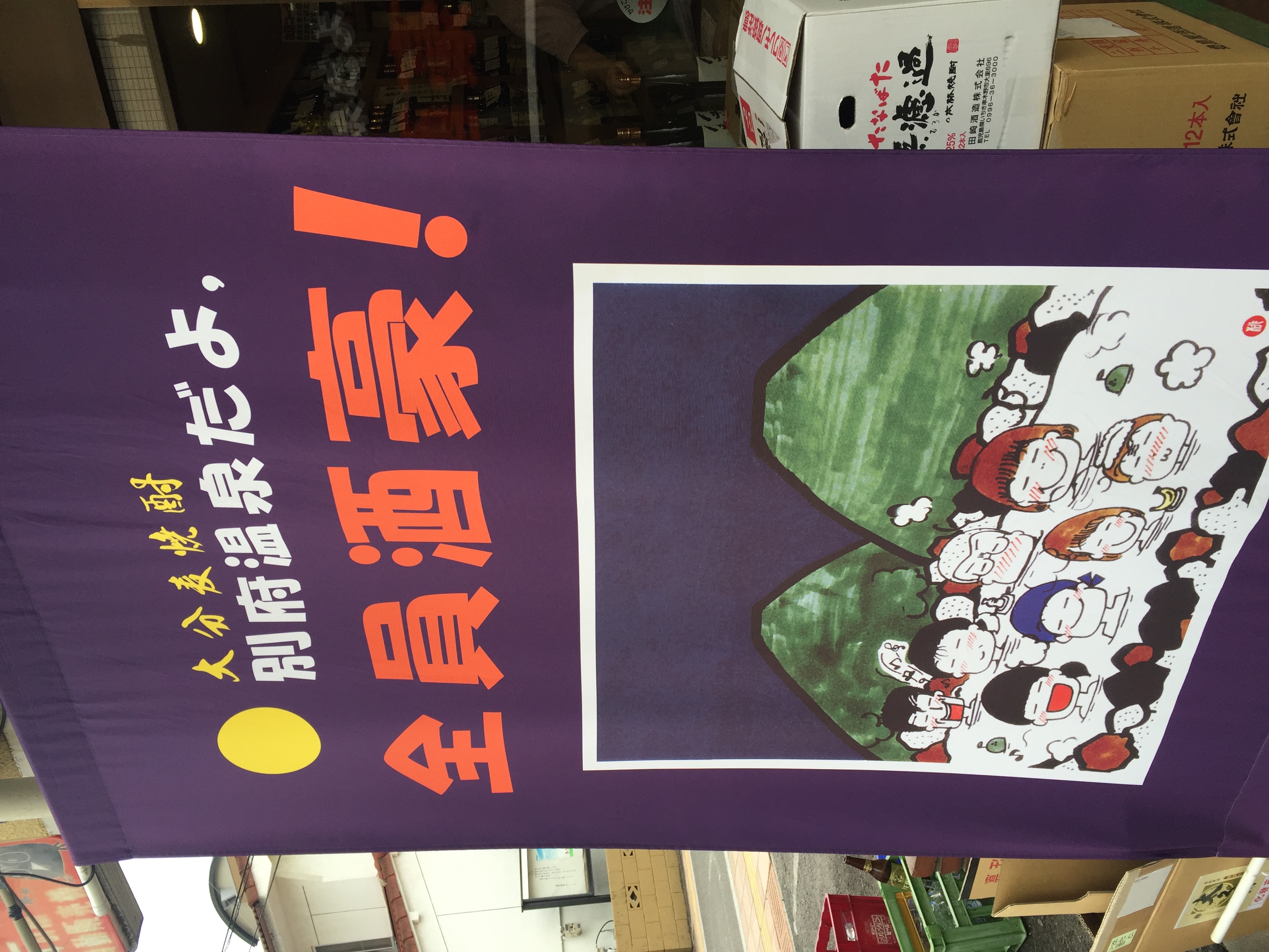 会場に入る前に見た「別府温泉だよ!全員酒豪」と書かれたのぼりがある酒屋さんの話をしましたら