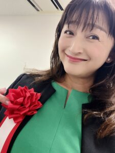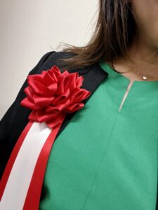 お花をつけて登壇するということで