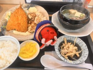 アジフライ、唐揚げも3個もどど~んとついています